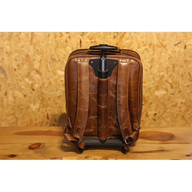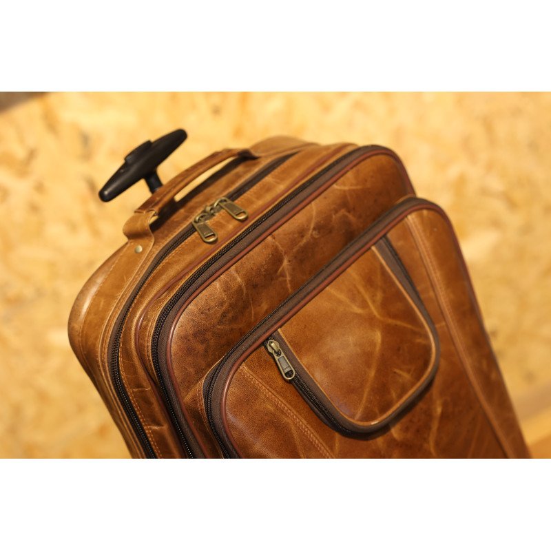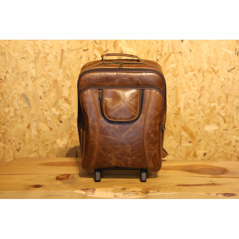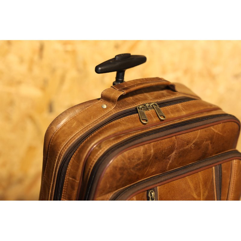A practical leather travel bag with smooth-rolling wheels and a telescopic handle for easy mobility. Designed with multiple compartments and a structured body, it combines durability with timeless style—perfect for business trips or long getaways.